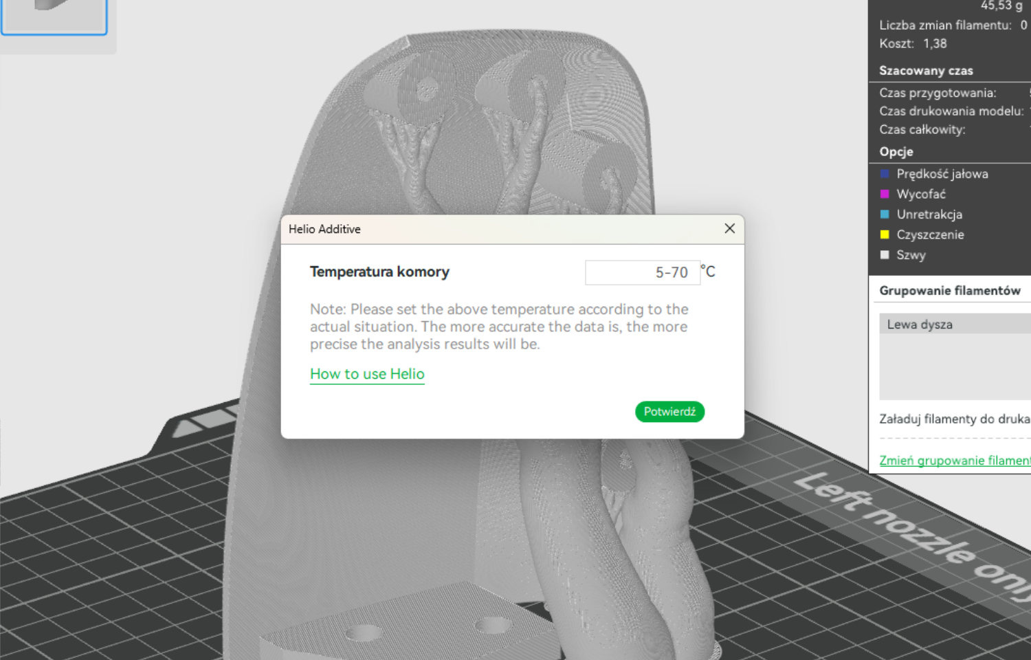 After completing the regular slicing process, a “Helio Action” button appears in BambuStudio, launching the simulation. The user enters an approximate chamber temperature and observes the simulation progress bar.