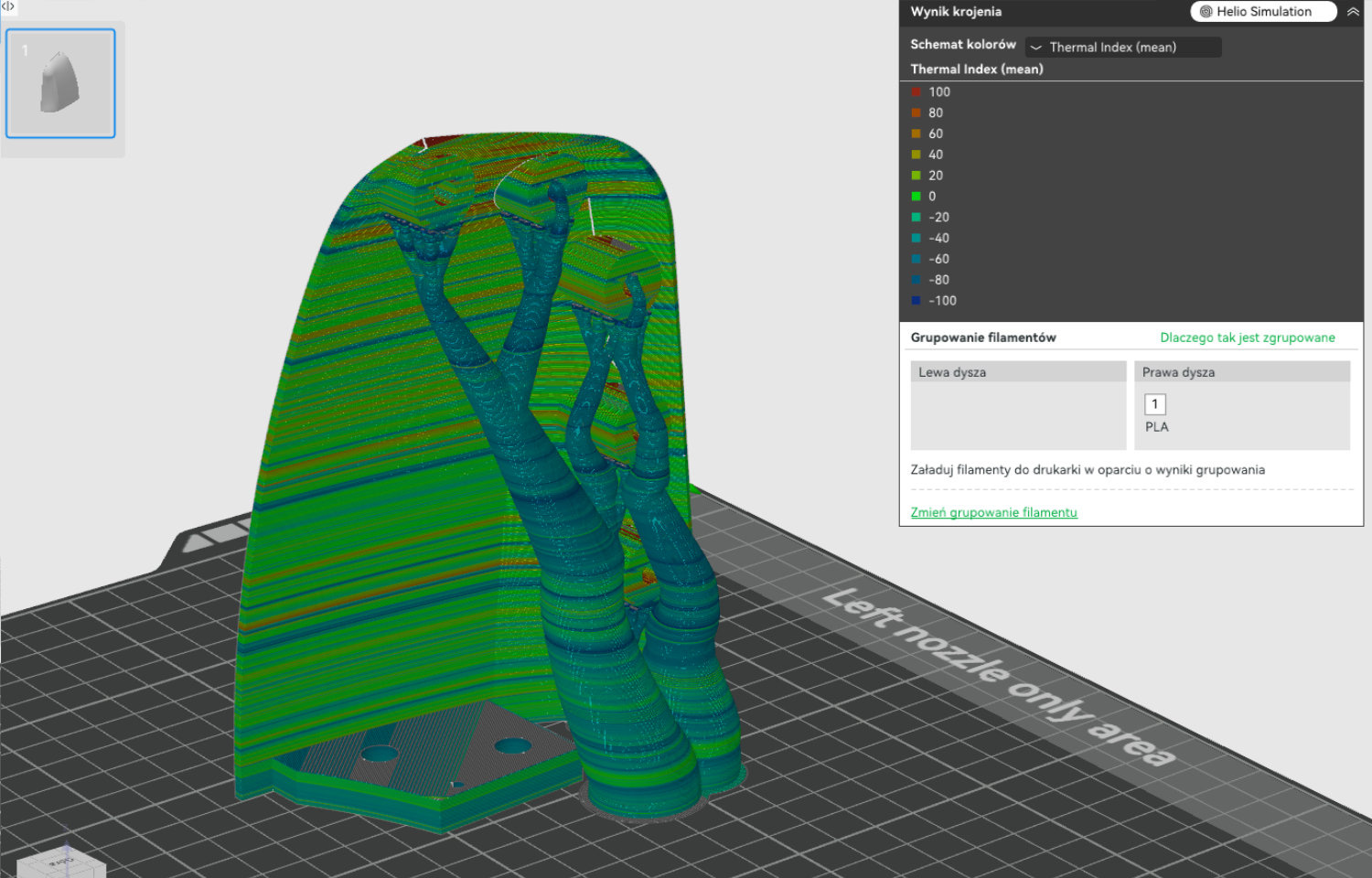 This allows the operator — before launching the physical print — to receive a “Thermal Index” of the model: a visual overlay showing areas that are too cold, optimal, or too hot, along with recommendations for settings (speed, temperature, interlayer time).