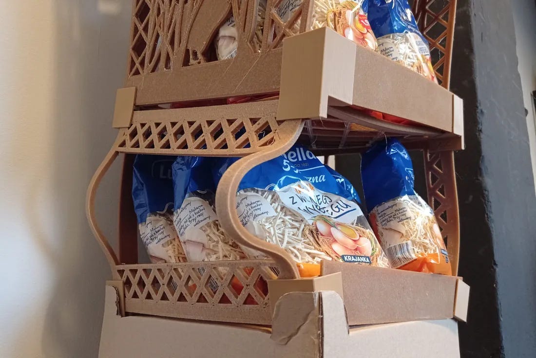 GREENFILL3D was a company that developed its own proprietary biodegradable filament based on wheat bran, a byproduct of pasta food production. Using this filament, it produced custom advertising stands - ECO POS - on 3D printers.