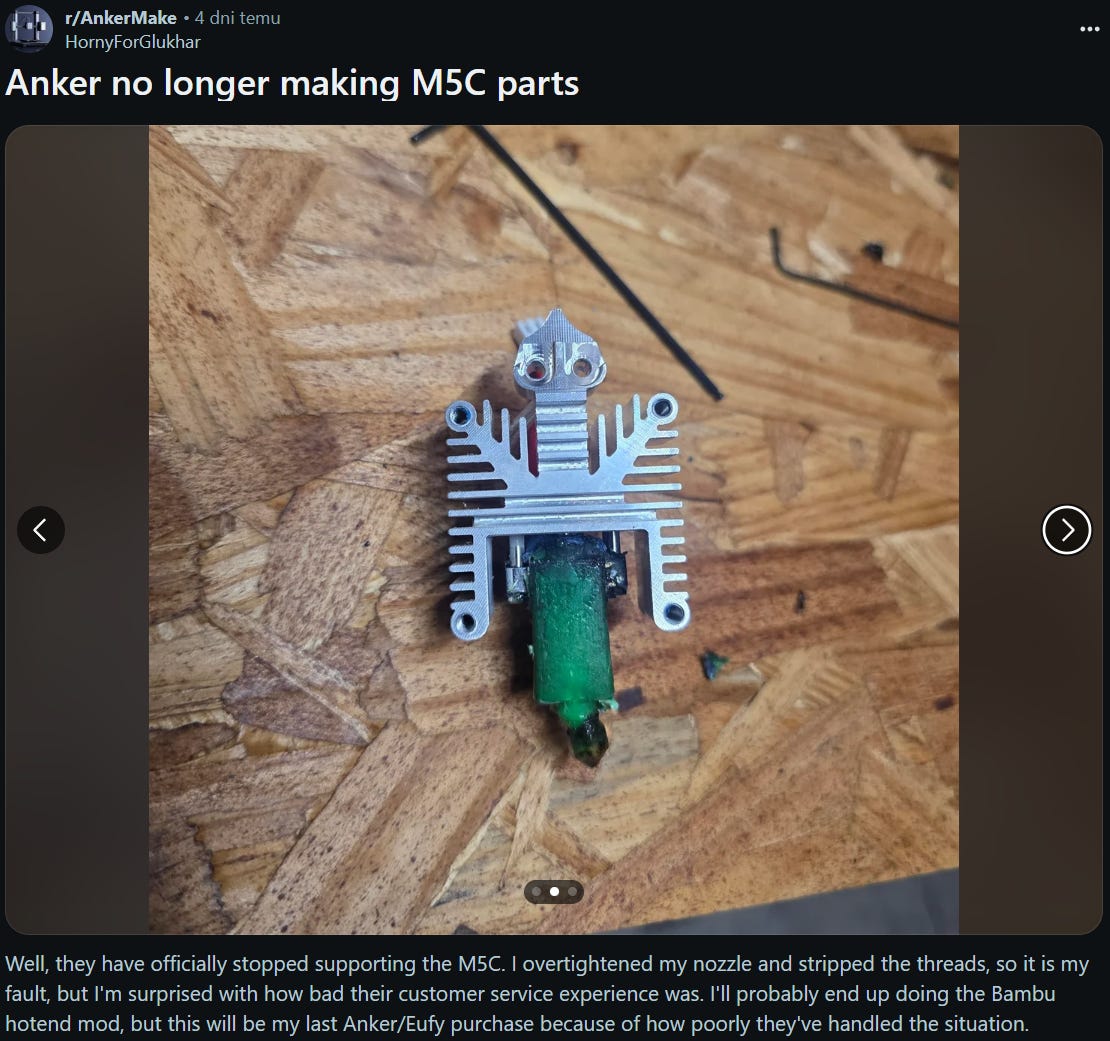 One Reddit user shared a message from EufyMake's technical support stating that the M5C hotend “has been removed from the offering due to limited inventory and is no longer available for purchase.” In response, the frustrated user asked, “So my printer is now useless because you stopped supporting it?”