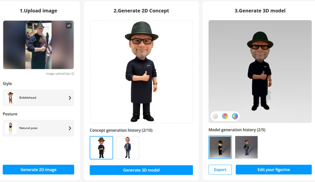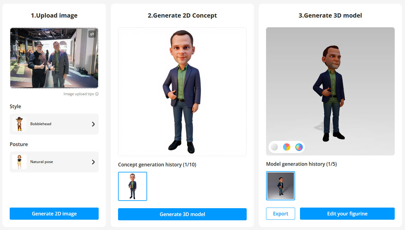 Only after approving the 2D view does the system generate the final 3D model, which can then be further edited in an integrated editor. Available options include base plates, name tags, color changes, and minor pose adjustments. From an AM perspective, what matters is that the model can be prepared as single- or multi-color and then exported as a file suitable for physical production.