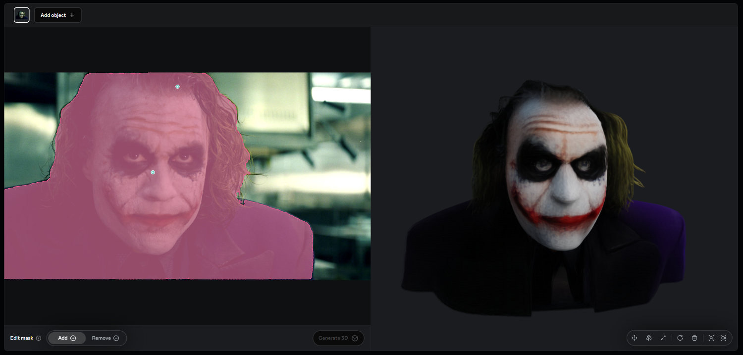 I started with the iconic photo of Heath Ledger’s Joker. I uploaded it and selected the area of focus. I simply clicked on the photo and the app automatically highlighted the region. Initially it only captured the face, but when I clicked on the hair it selected the entire silhouette. Then I clicked “Generate 3D.” The result… well… amusing, to say the least: