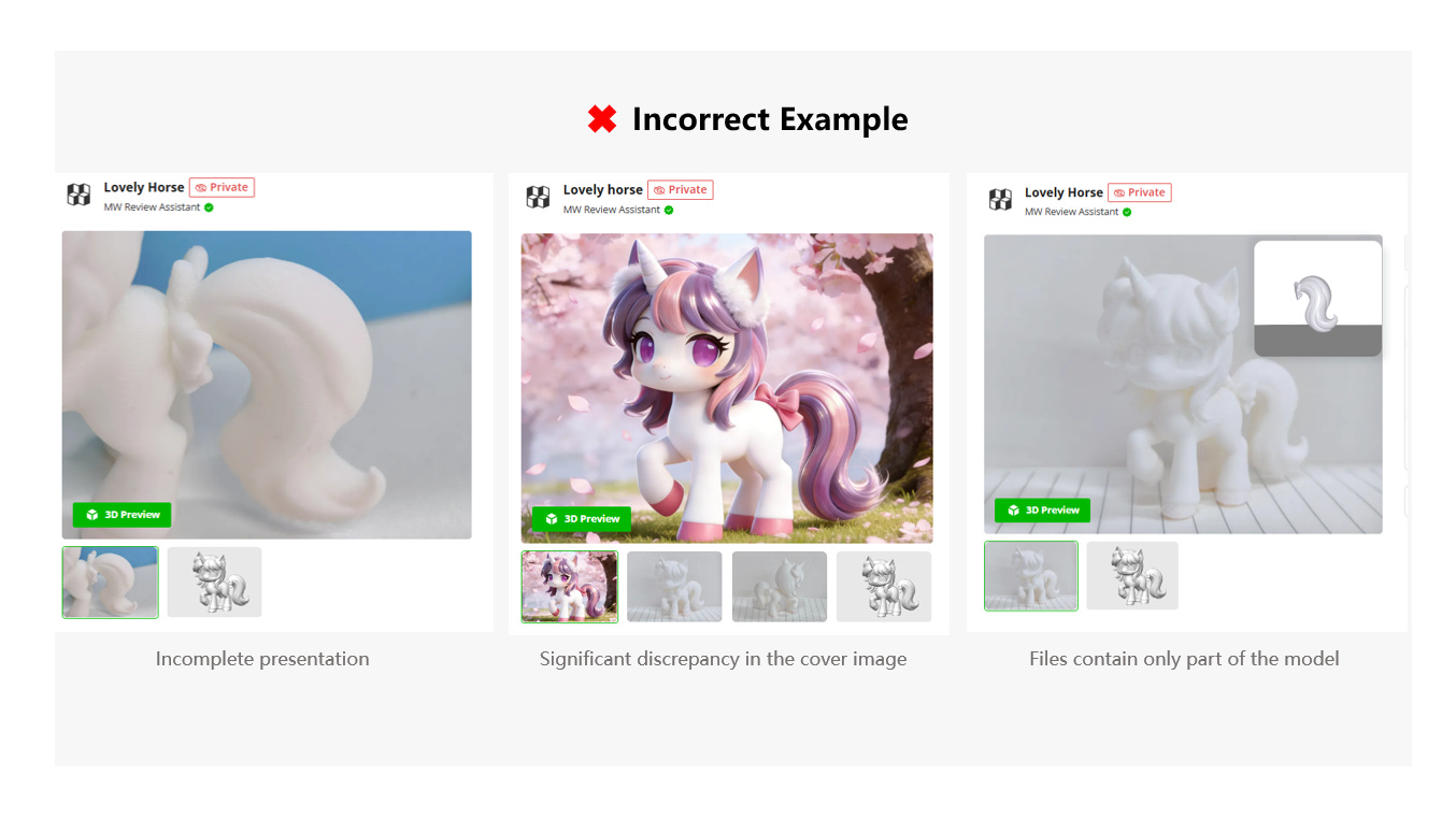 Against this backdrop, attempts at systemic solutions are emerging. One of them is the MakerWorld initiative, which introduces clear rules regarding how models are presented. A key element is the requirement to include photos of real prints as an integral part of a project’s presentation.
