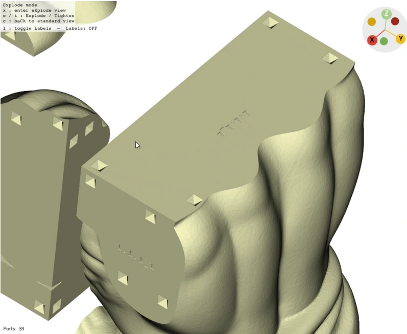 Split3r automatically divides the object into smaller parts, adds fitting joints in the form of hollow pyramids, and generates alignment pins (tenons).