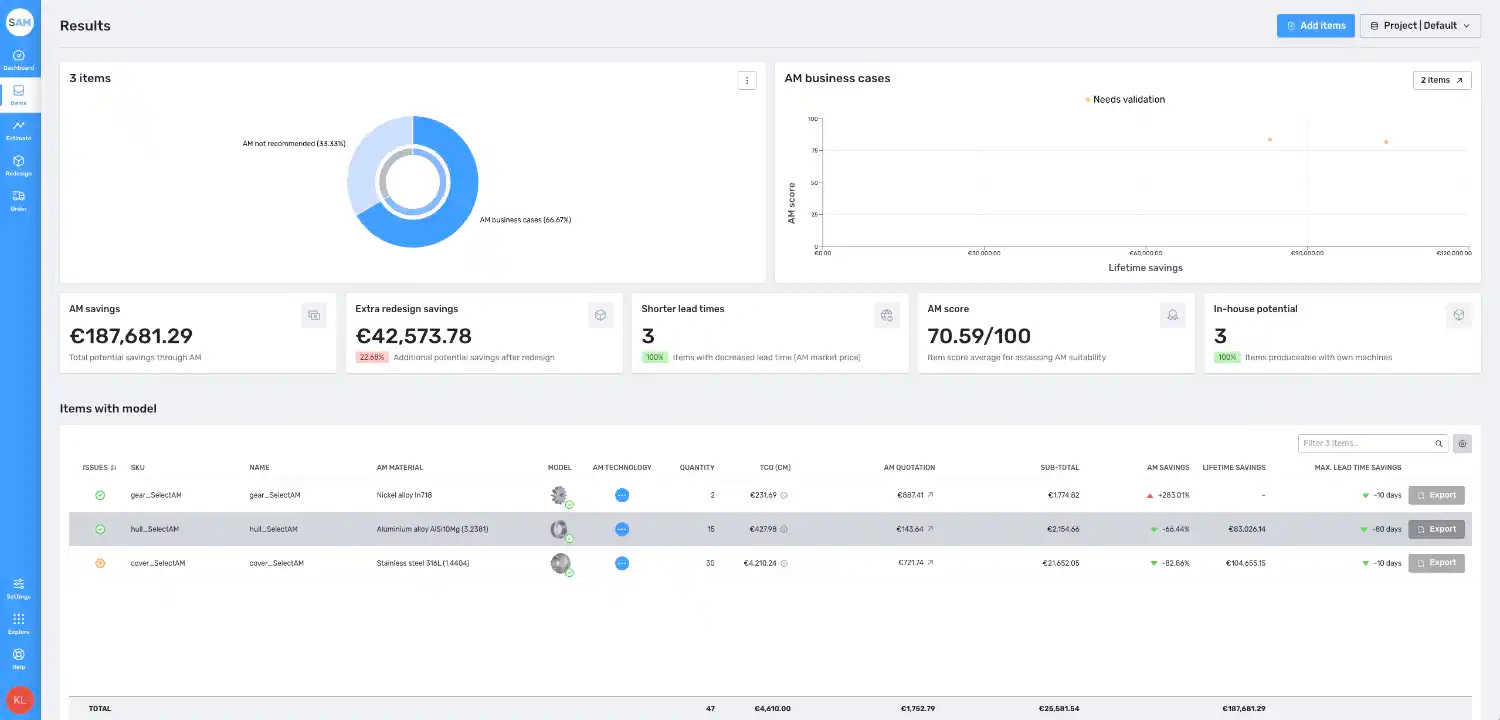 For OEMs and AM appliers, this provides a clear, data-driven path to integrate AM, identifying parts suitable for cost reduction and improved lead times. Also, their AI-based engines like the redesign impact analysis, or the 2D drawing to 3D model conversion tool are available for faster digitalisation and decision making.