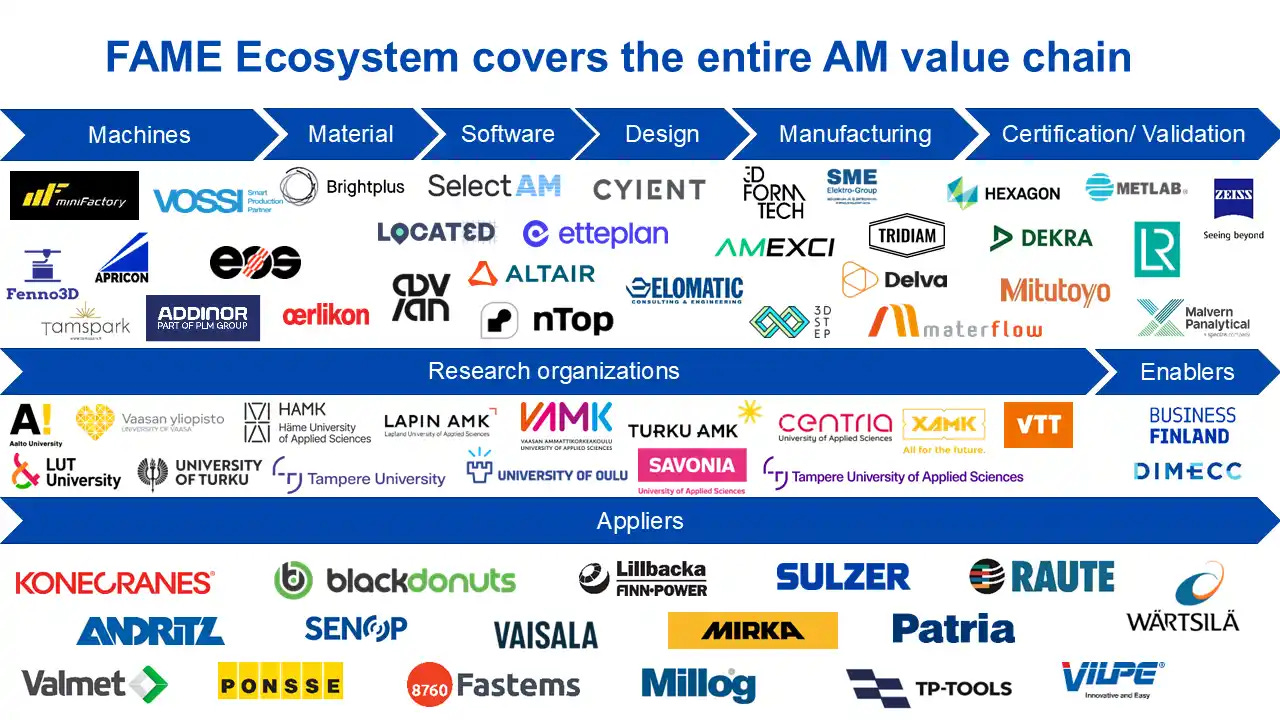 3D printing is being nationally promoted, among others, by the Finnish Additive Manufacturing Ecosystem (FAME, operated by DIMECC Ltd). FAME is a consortium of over 50 companies that covers the entire 3D printing value chain and whose vision is to create a competitive advantage for Finland through sustainable additive manufacturing.